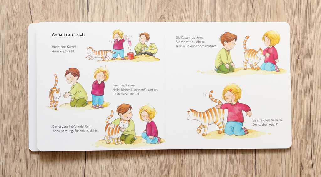 Sandra Grimm nimmt in diesem Pappbilderbuch Kleinkinder mit auf eine Reise durch die Welt der Gefühle. Sie erzählt kleine Geschichten, die an typischen Kindererlebnissen angelehnt sind: Eine Überraschung von Oma, spielen mit Freunden, Entdecken der Natur. Kinder können sich in diese Geschichten hineinversetzen, da sie ähnliches selbst schon erlebt haben. Damit fällt es ihnen auch leichter zu verstehen, was das Kind fühlt, wie es sich fühlt. Diese kleinen Geschichten, die sich über eine Doppelseite erstrecken und mit wenigen Worten erzählt sind, bieten gute Einstiegsmöglichkeiten in Gespräche. Gespräche zwischen Eltern und Kinder, aber auch zwischen Pädagogen/-innen und Kindern. Denn das Buch kann nicht nur zuhause in der Familie zum Einsatz kommen, sondern auch in Kinderkrippen und Kindertagesstätten. In diese Gesprächen kann man eigene Erlebnisse einfließen lassen, diese verarbeiten und auch über die eigenen Empfindungen sprechen. Das hilft, Gefühle zu verstehen und mit ihnen umgehen zu lernen. So holt Sandra Grimm die Kinder auf ihrem Entwicklungsstand ab und hilft, den nächsten Entwicklungsschritt zu machen.