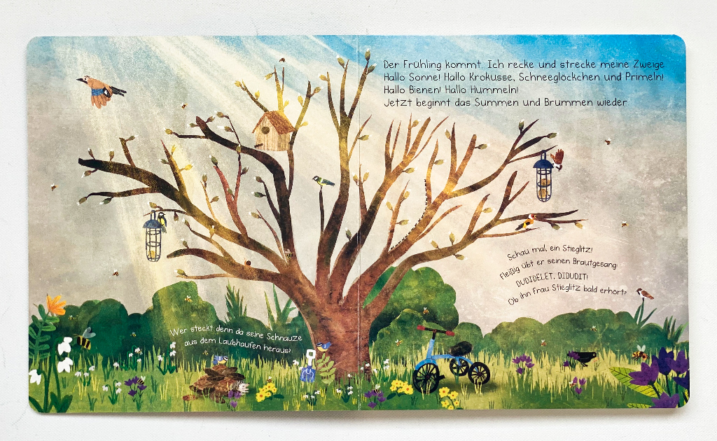 „Das Nest in meinen Zweigen“ ist die Geschichte eines Tulpenbaums im Wandel der Jahreszeiten. Anna Taube erzählt uns, wie sich dessen Aussehen verändert, welche Tiere hier anzutreffen sind und welche Veränderungen jede Jahreszeit mit sich bringt. Carmen Saldaña hat dies stimmungsvoll in Bildern festgehalten. So entstand ein Pappbilderbuch, das zu einer besonderen Reise durch den Jahreskreislauf einlädt.