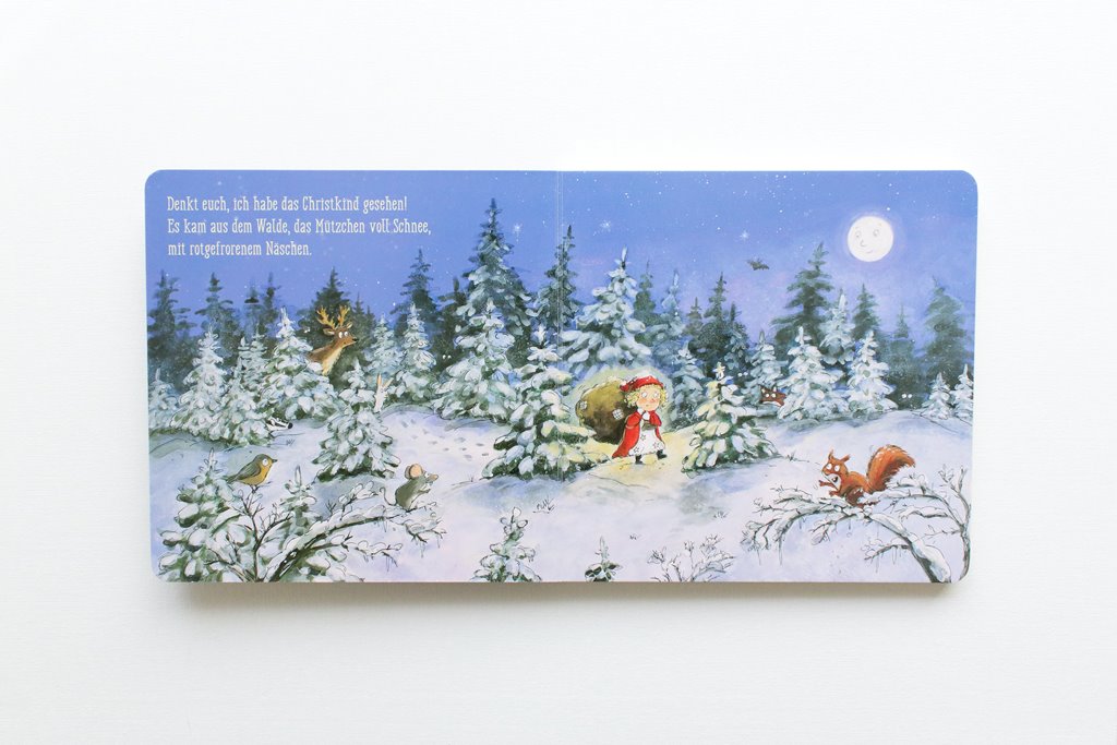 Dieses Gedicht also wurde nun einmal mehr aufgegriffen, inhaltlich nicht verändert, aber äußerlich in ein neues Gewand gesteckt. Christine Kugler schuf zu den einzelnen Zeilen wunderbare Illustrationen, zeigt uns das blondgelockte, in einem warmen Mantel gehüllte Christkind, wie es schwer beladen durch den Wald stapft. Genauso, wie Anna Ritter es beschreibt. Neugierig kommen die Tiere des Waldes hervorgehuscht, schauen was das zarte Kind dort mit sich trägt. Auch der Mond am Himmelszelt schaut erstaunt herab. Es bleibt nicht beim Staunen, nein, die Tiere bieten ihre Hilfe an. Der Hirsch nimmt das Christkind auf seinen Rücken, während Fuchs, Dachs, Eichhörnchen, Maus und Hase den schweren Sack tragen. Durch den verschneiten Wald und hin zu dem Dorf, in dem die Kinder bereits sehnsüchtig auf die Ankunft des Christkinds warten.
