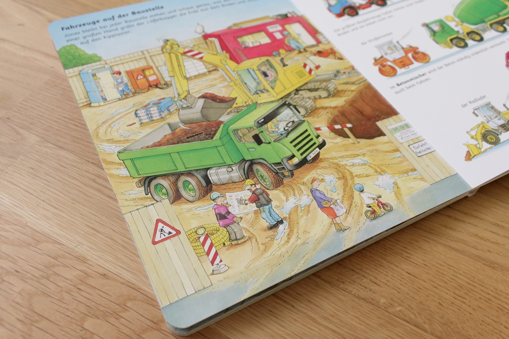 Die Illustrationen sind alters- und kindgerecht. Große, ganzseitige Szenen mit vielen Details wechseln sich mit Abbildungen von Fahrzeugen und Zubehör ab. Anschließend gibt es wieder eine Doppelseite mit großflächigen Bildern. Durch diese Wechsel wirkt das Buch lebendiger und abwechslungsreicher.