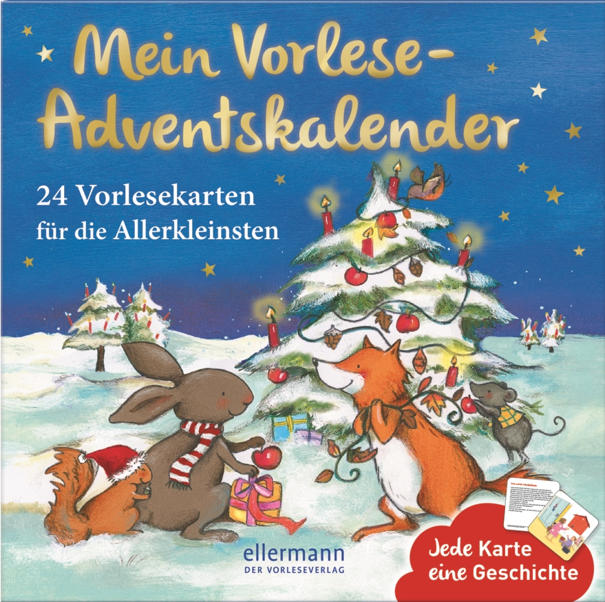 Ein schöner Brauch zur Weihnachtszeit ist es, mit einem Adventskalender das Warten auf den Heiligen Abend zu verkürzen. Diese Kalender gibt es mittlerweile in den unterschiedlichsten Ausführungen. Ein besonders schöner für die Allerkleinsten ist im ellermann Verlag erschienen. Dieser besteht aus 24 Vorlesekarten, auf denen weihnachtliche Geschichten zu finden sind. "Mein Vorlese-Adventskalender".