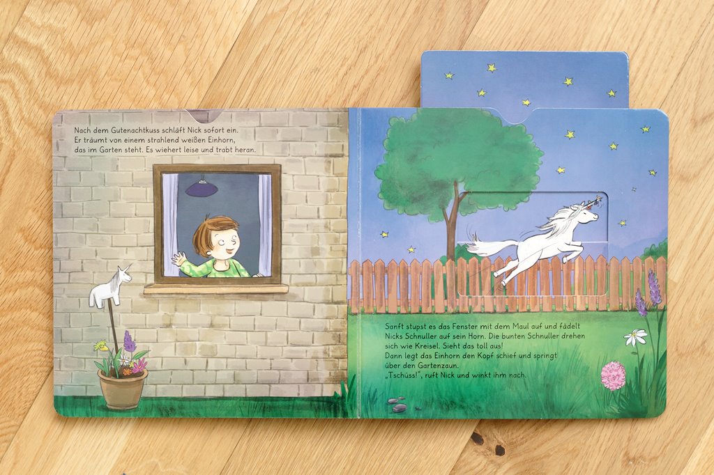 Die Freunde Nick und Anni spielen zusammen im Garten. Auch beim Spielen hat Nick seinen Schnuller im Mund. Da verkündet ihm Anni, dass sie schon groß ist und ihren Schnuller dem Schnullereinhorn geschenkt hat. Dafür hat sie ein weißes Spielzeugpferd mit Glitzermähne geschenkt bekommen. Nick findet das super. Da er auch schon groß ist, legt er gleich am nächsten Abend alle seine Schnuller auf die Fensterbank. Tatsächlich kommt in der Nacht das Schnullereinhorn vorbei und nimmt sie mit. Zurück bleibt eine tolle Überraschung, die sich Nick schon so lange gewünscht hat.