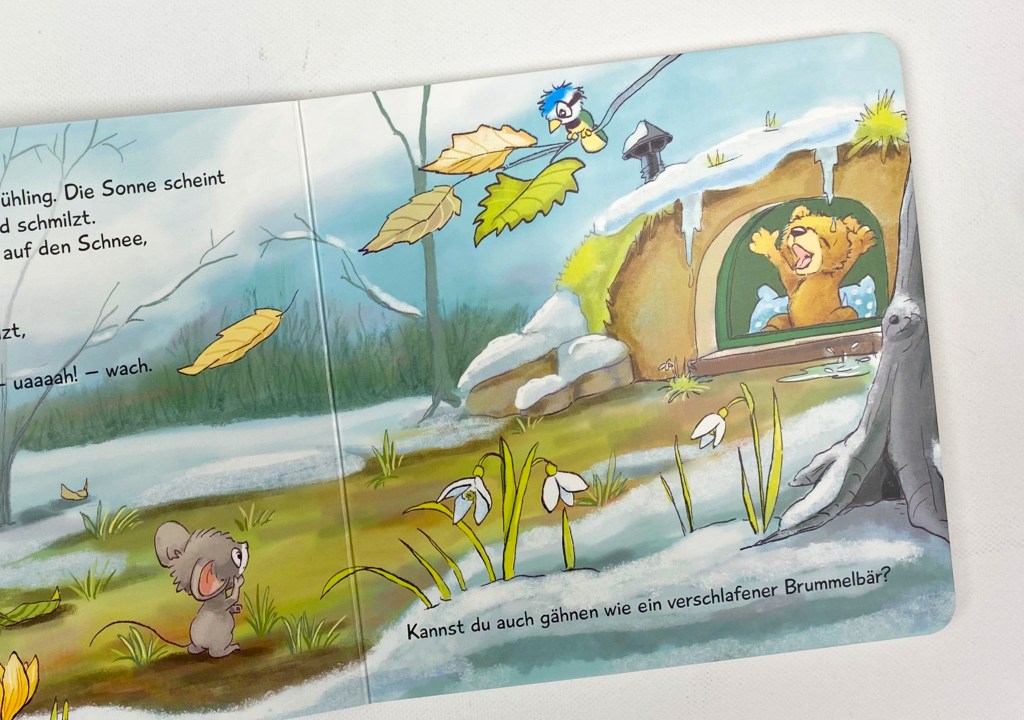 Diese herzige Tiergeschichte für Kinder ab 24 Monate hat ganz viel zu bieten. Sie erzählt von einem kleinen Bären, der aus dem Winterschlaf erwacht und in ein neues Frühjahr startet. Gleichzeitig ist es auch ein Mitmachbuch, bei dem das junge Lesepublikum durch kleine Aktionen die Handlung begleiten kann. Denn auf jeder Doppelseite lädt der Text sie zu Aktivitäten ein. Mal sollen sie klatschen, ein anderes Mal gähnen und kurz darauf dem Bären bei kleinen Handgriffen helfen. Damit wird Kindern das Gefühl vermittelt, aktiv an der Geschichte teilzunehmen. Sie erleben das Erzählte intensiver und tauchen konzentrierter in die Geschehnisse ein. Annette Langen erzählt liebevoll und warmherzig von dem kleinen Bären, dessen Namenszusatz „Brummel“ nur teilweise stimmt. Denn bei ihm handelt es sich ganz gewiss nicht um einen schlecht gelaunten Gesellen, sondern eher um jemanden, der an diesem Morgen etwas länger braucht, um seine Fröhlichkeit zu finden. Und seien wir ehrlich, auch wir kennen solche Tage, an denen wir vor dem Frühstück oder wenigstens dem ersten Kaffee nicht ansprechbar sind. Genauso ist es auch bei dem Brummelbären. Nachdem er gefrühstückt und seien Pfoten gewaschen hat, ist er richtig gut gelaunt und lässt sich nur zu gern auf das Spiel mit seinen Freunden ein.