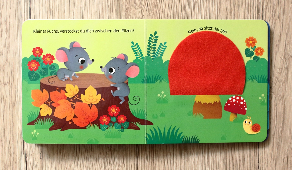 Die Geschichte dieses Pappbilderbuchs nimmt Kleinkinder mit auf einen lustigen Spaziergang durch den Wald. Vor dem Hintergrund, dass wir den kleinen Fuchs suchen, lernen die Allerkleinsten viele Tiere kennen, darunter Reh, Eichhörnchen und Igel. Sie alle verbergen sich dort, wo wir den kleinen Fuchs wähnen. Dargestellt wird dies durch große Klappen, die aber nicht aus Pappe bestehen, sondern aus weichem Filz. Damit wird den Kleinsten nicht nur ein Element zum Befühlen geboten, es erleichtert ihnen auch den Umgang mit den Klappen. Anders als bei Pappe, macht es diesen Klappen nichts aus, wenn sie umgeknickt oder verbogen werden. Wenn sie durch noch fehlende Feinmotorik zusammengerollt werden. Sie reißen nicht ein und bekommen keine unschönen Knicke. Der Filz legt sich ebenso glatt wieder zurück und bietet auch beim nächsten Mal wieder Entdeckerspaß.
