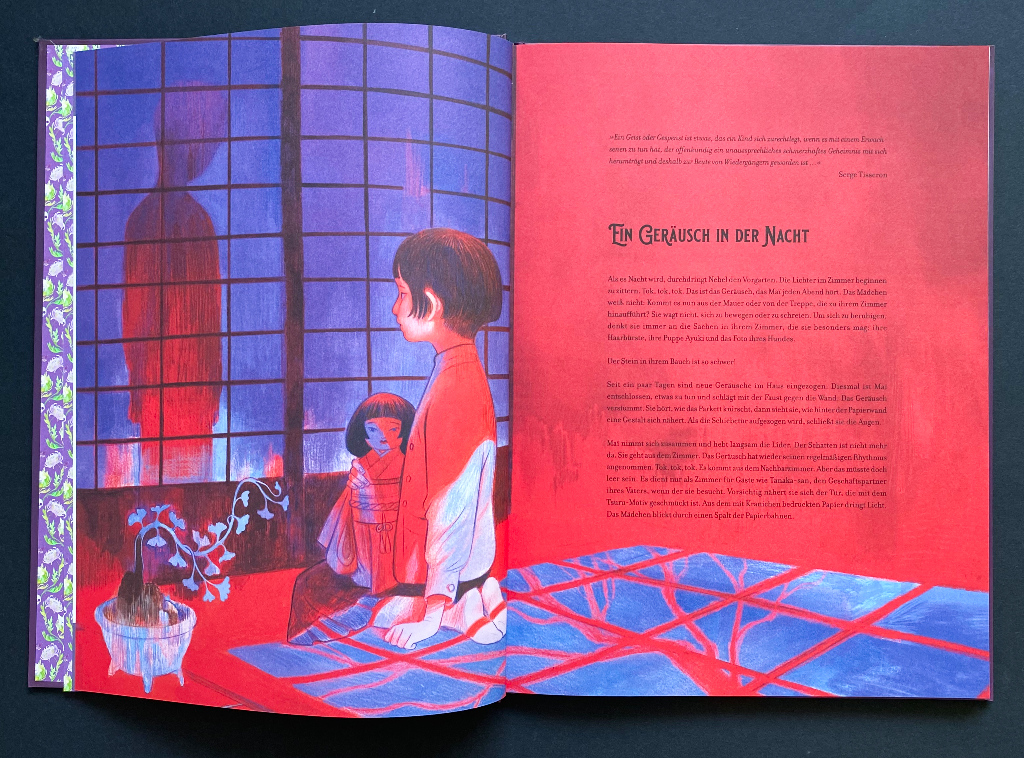 Das Buch beginnt mit der Geschichte des Mädchens Maï. Seit kurzem hört sie jede Nacht ein gleichmäßiges Pochen im Nachbarzimmer. Einem leeren Zimmer, in dem gelegentlich Tanaka-san, ein Geschäftspartner ihres Vaters, übernachtet. Doch nicht in dieser Nacht. Da ist das Zimmer leer. Eigentlich. Dennoch erklingen seltsame Geräusche aus ihm. Als Maï einen Schatten hinter der mit Kranichen bedruckten Papierwand sieht, bekommt sie Angst und schließt fest ihre Augen. Als sie diese öffnet, ist der Schatten verschwunden, doch das gleichmäßige Klopfen ist geblieben…