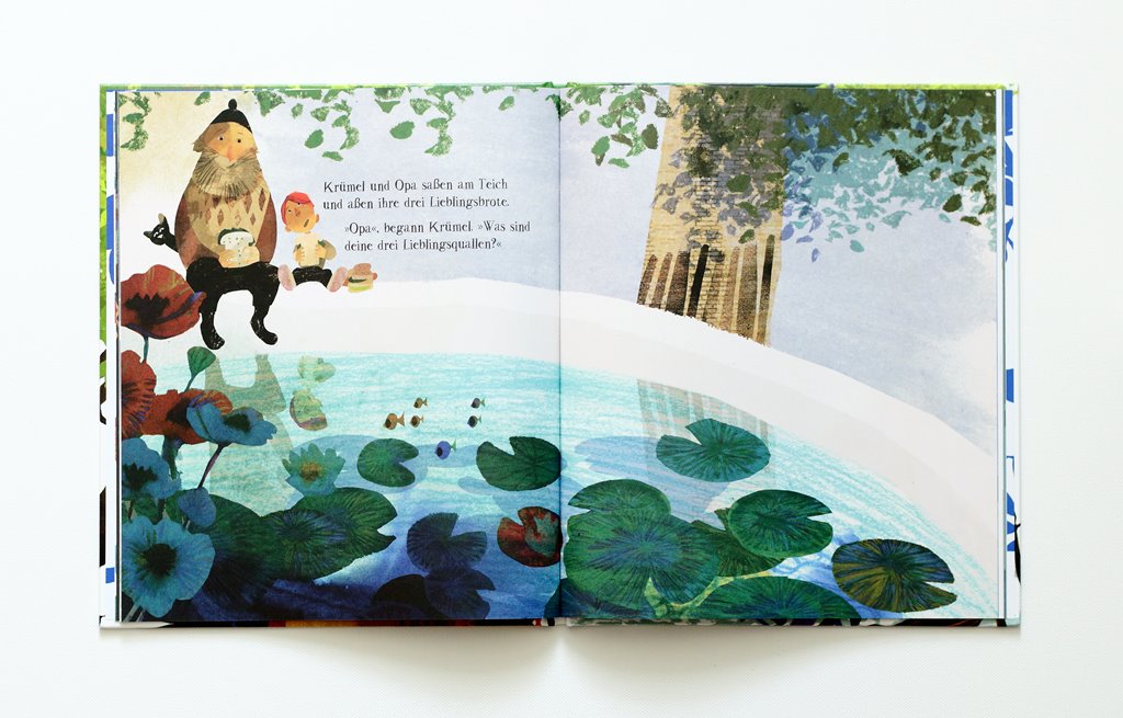 Begleitet wird das Buch von Daniel Egnéus‘ wunderbaren Illustrationen. Die lebendigen und farbenfrohen Bilder spiegeln die Grundstimmung der Geschichte wider. Die Mischung aus klaren Linien und losen Farbtupfern fangen flüchtige und besondere Momente des Geschehens ein. Die Bilder sind klar und verträumt zugleich. Sie zeugen von Tiefe und zeigen mit warmen Farben glückliche Augenblicke zwischen Enkel und Opa.