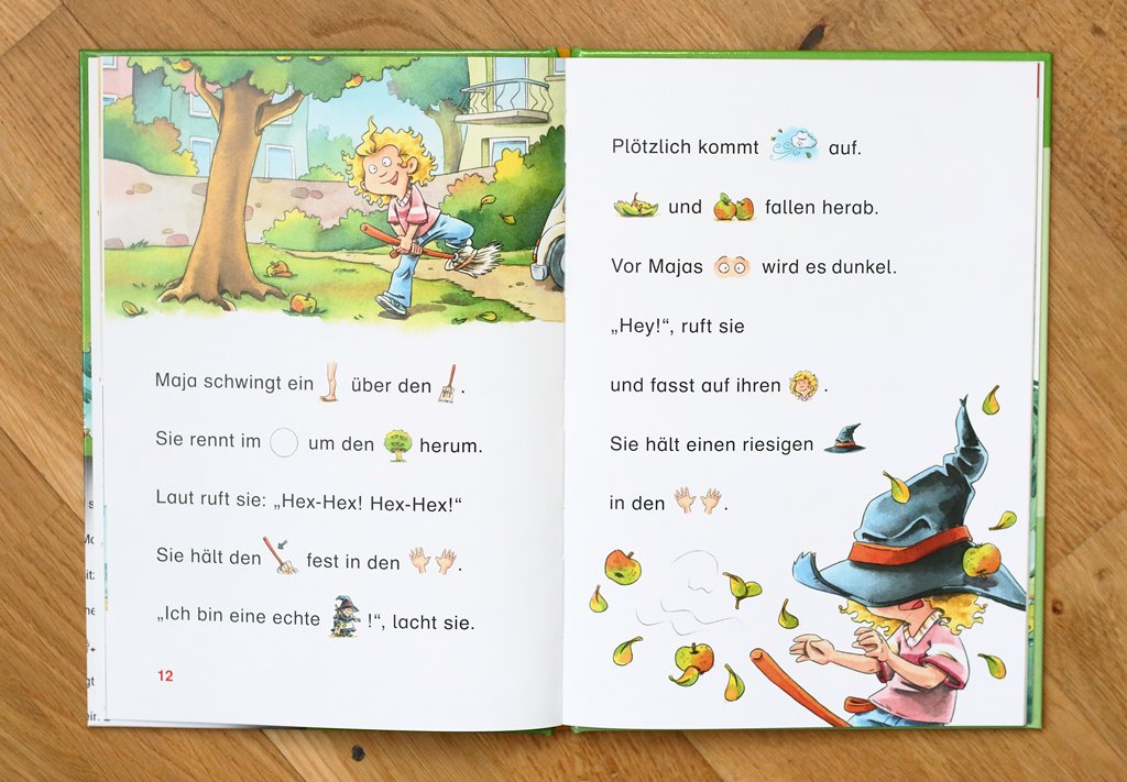 Das Textbild ist klar gestaltet. Eine große Fibelschrift ermöglicht es Leseanfängern der ersten Lesestufe ebenfalls, das Buch zu lesen. Große Zeilenabstände geben nicht nur Raum, um die Symbole für die Hauptwörter gut erkennbar einzufügen, sie lockern auch den Textfluss auf. Zu guter Letzt gliedert sich das Abenteuer in mehrere Kapitel, die von einem Doppelseitigen Such-Wimmelbild eingeleitet werden. Den Abschluss bildet eine Wörter-Bilder-Liste, bei der man im Zweifelsfall nachschauen kann, was ein Symbol bedeutet. Übrigens finden sich in der Geschichte einige Profifragen, deren Lösung es ebenfalls im Anhang gibt.
