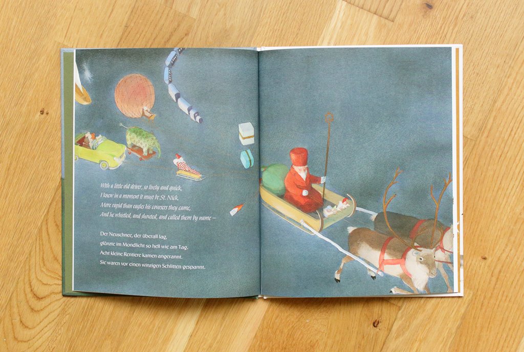 „Einmal werdet ihr noch wach…“ - diese eine letzte Nacht vor Weihnachten ist gefüllt mit Erwartungen, mit Vorfreude und Aufregung. Morgen wird endlich der Weihnachtsmann kommen und aus seinem großen Sack die Geschenke hervorholen. Welches Kind ist da nicht aufgeregt? Diesen Zauber, diese Stimmung hat Clement Clarke Moore vor über 100 Jahren in seinem Weihnachtsgedicht „The Night Before Christmas“ eingefangen. Dieses ist nun in zweisprachiger Ausgabe im Verlag minedtion erschienen.