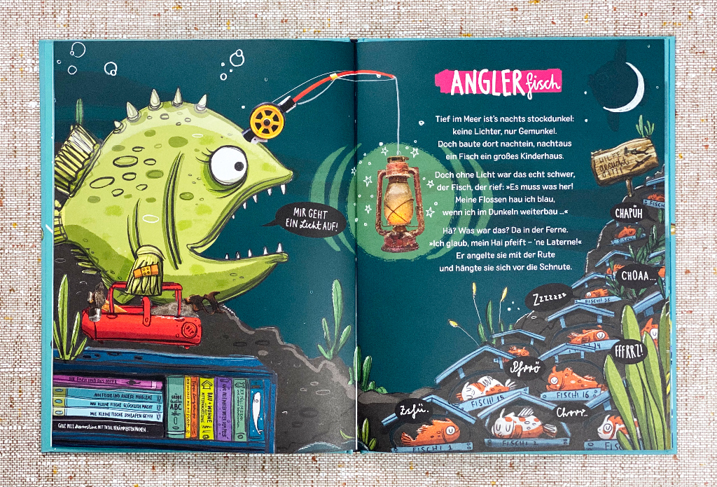 Erklärt man Kindern diese hochwissenschaftliche Namensgeben, ist das natürlich stinklangweilig. Etwas Lustiges musste her und Anne-Kristin zur Brügge fühlte sich dazu berufen. Originell, einfallsreich und wunderbar komisch präsentiert sie mit ihren Flachwitzen eine tolle Erklärung, warum Meerestiere heißen, wie sie heißen. Die Illustrationen dazu schuf Merle Goll, die den Humor der Verse ganz wunderbar eingefangen hat. Was die Autorin beschreibt, findet sich in den farbenfrohen, verrückten Zeichnungen wieder. Modern und originell gestaltet, sehen wir hier Collagen, die obendrein mit frechen Sprechblasen versehen sind. Und wer nun neugierig geworden ist, wie die Tiere in Wirklichkeit aussehen, der findet am Ende des Buchs auch eine Doppelseite mit entsprechenden Fotos. Alternativ kann man natürlich auch das nächste Meeresmuseum oder Aquarium in der Nähe besuchen.