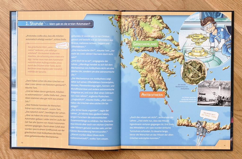 Die Crew von Space Camp 1 hat schon einige Erfahrung mit künstlichen Intelligenzen. Neben der Roboterkatze Plutinchen, die gewissermaßen zur Familie gehört, sind bereits ein Hund und ein Pandabär in der Reihe „Der kleine Major Tom“ vorgekommen, die ebenfalls KIs waren. Doch hat das Konzept eines künstlichen Gehirns ist viel älter. Davon erfahren Stella und Tom während des Unterrichts in der „Space School“.