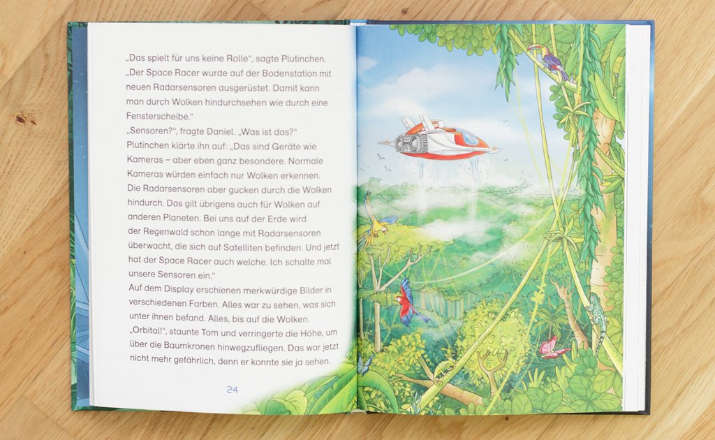 Im achten Band bleiben wir auf der Erde und wenden uns unserem Heimatplaneten zu. Denn dieser hat ebenfalls viel zu bieten, das es zu erforschen gilt. Bernd Flessner richtet seinen Blick auf einen ganz besonderen und für unsere Welt wichtigen Lebensraum: den Regenwald. Dank des mittlerweile reparierten Space Racer können unsere jungen Forscher direkt dorthin fliegen und den südamerikanischen Regenwald mit eigenen Augen entdecken. Gleichzeitig erklärt Flessner auf einfache, kindgerechte Weise, welche Bedeutung der Regenwald für unser Klima hat, was Fotosynthese ist, welche außergewöhnlichen Tiere im Dschungel leben. Vor allem Schlangen begegnen unsere vier Freunde des Öfteren.