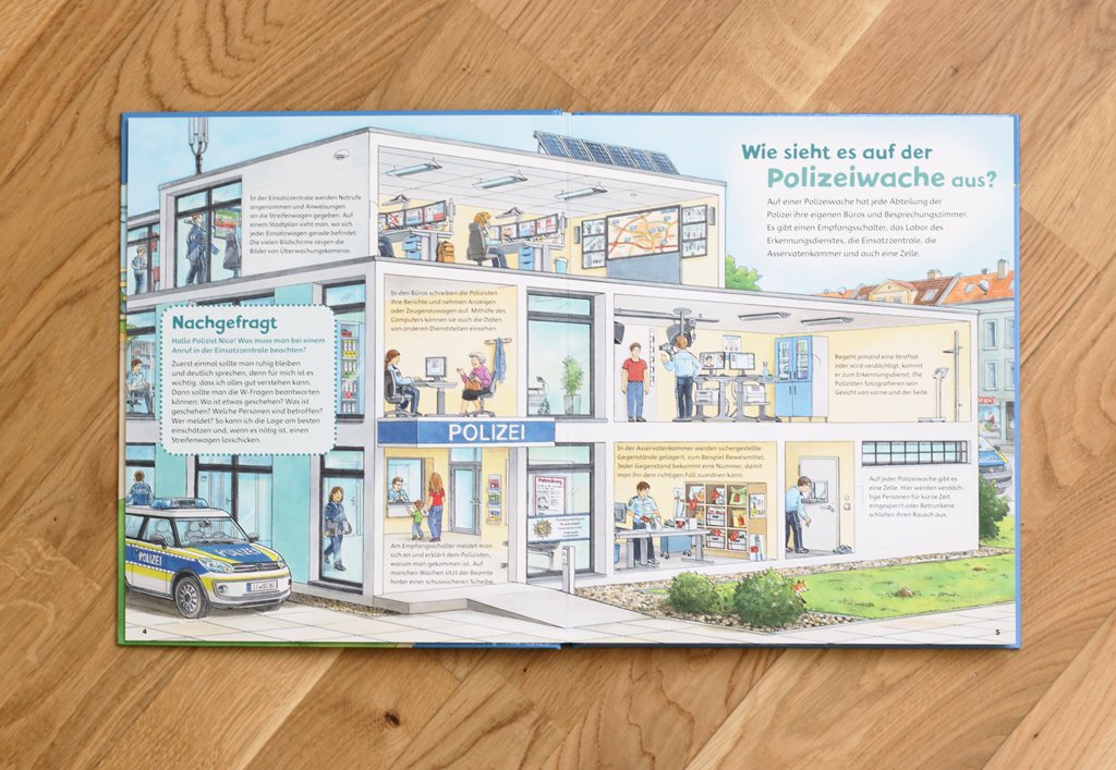 So begeistert das Buch auf ganzer Linie. Viele Klappen gewähren einen tieferen Einblick, verändern Straßenszenen oder lassen hinter die Kulissen blicken. Neugierig verfolgen Kinder jedes Kapitel, hören ganz genau zu und fragen auch zu bestimmten Themen nach. Schon mehrmals angesprochen überzeugen natürlich die Illustrationen. Realistisch und detailgenau gezeichnet, geben sie Kindern einen guten Eindruck von der Polizeiarbeit.