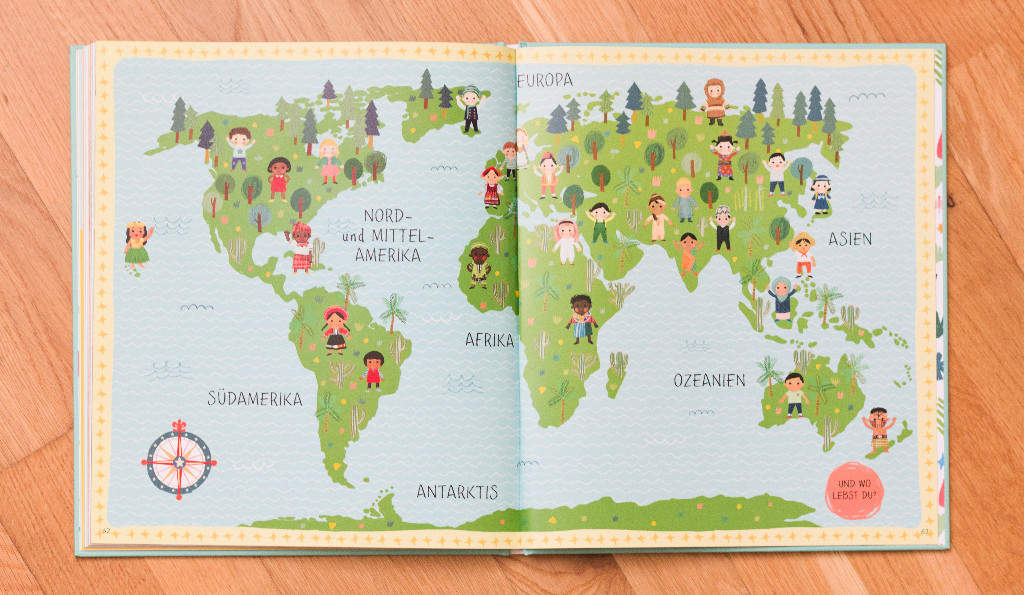 Unsere Welt ist groß und bunt. Über sieben Milliarden Menschen in fast 200 Ländern leben auf ihr und sprechen mehr als 7000 Sprachen. Klar, dass es da unglaublich viele Unterschiede gibt, auch in Lebensweisen, Verhalten, Gewohnheiten, Speisen, Kleidung… Doch trotz all dieser Unterschiede gibt es auch viele Gemeinsamkeiten. Wir müssen essen, wir müssen uns kleiden, wir reden miteinander, wir lernen, wir gehen arbeiten, wir sind glücklich und wir sind traurig. Moira Butterfield nimmt Kinder mit auf eine Reise durch die Welt und zeigt ihnen in ihrem Buch besondere Momente, Gemeinsamkeiten, Unterschiede und noch so vieles mehr.